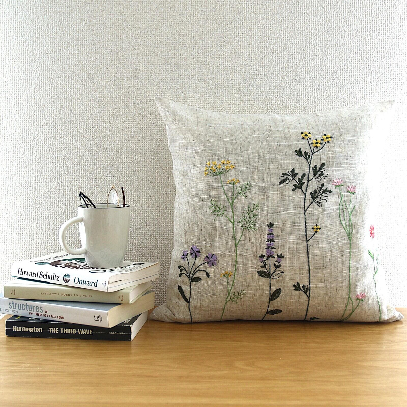 【 クッションカバー 】ボタニカル刺繍」 麻素材 花柄 異素材ミックス【45×45cm】★ インテリア クッションカバー ファブリック 北欧テイスト FABRIC LIVING BED