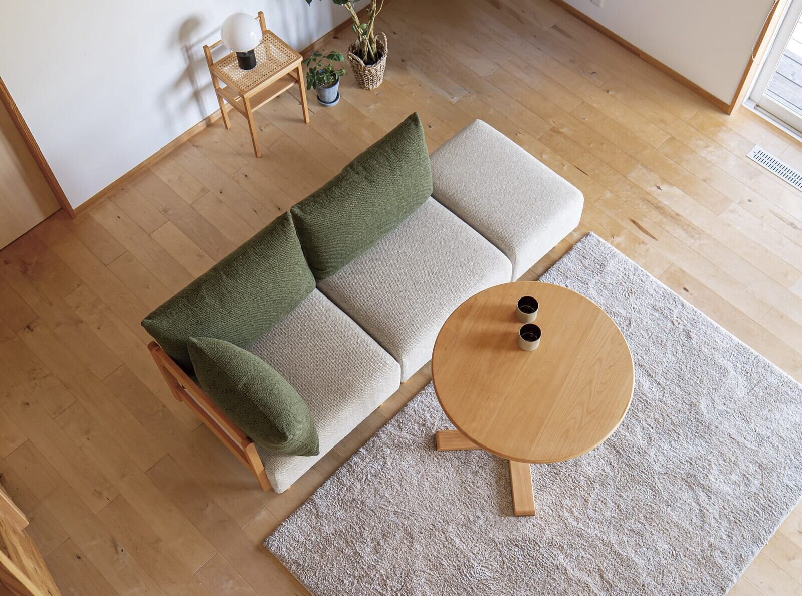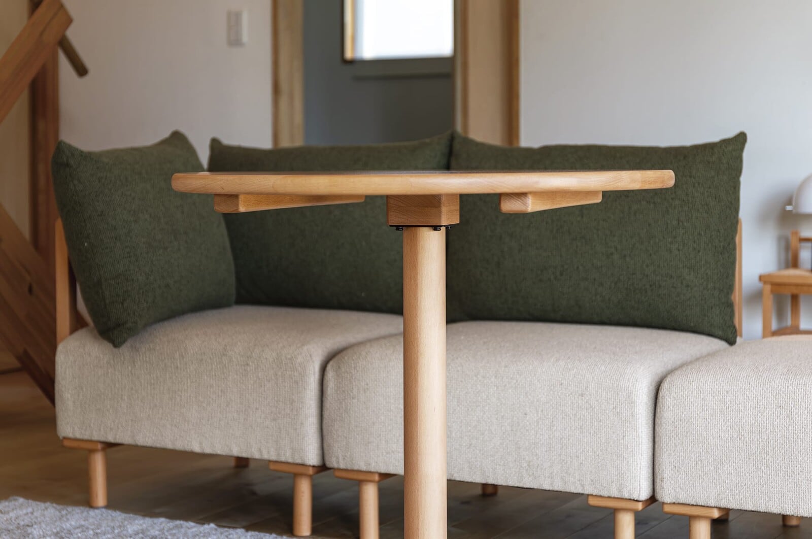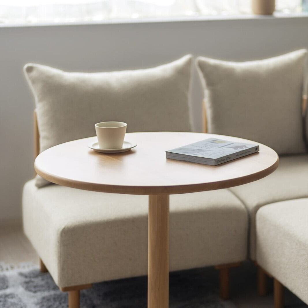 ラウンド型の天板はソファ前でも圧迫感がなく、コンパクトな空間で使いやすいテーブル