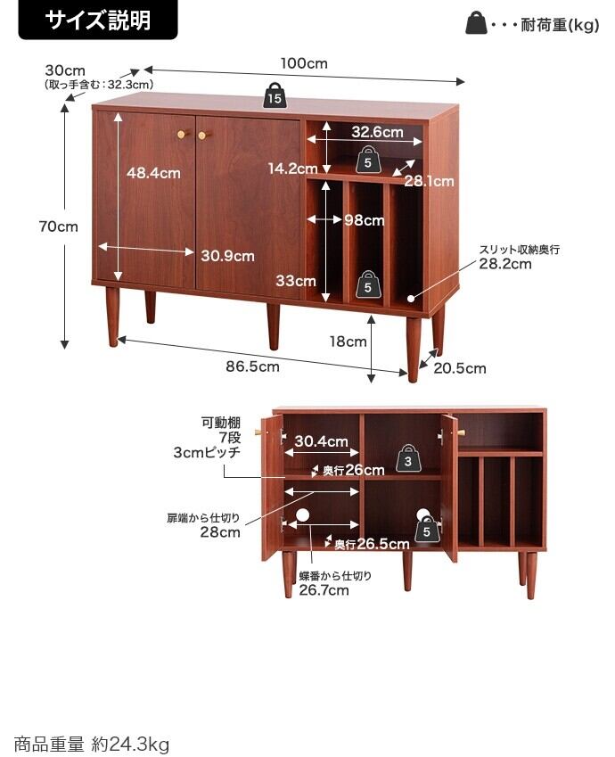 ■耐荷重:天板:約15kg 、可動棚板:各約3kg、底板:各約5kg、オープン収納:約5kg、