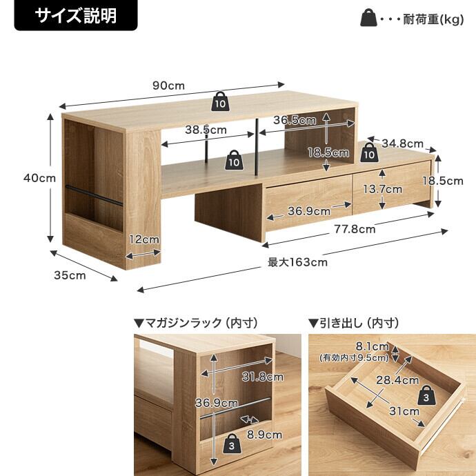 ■耐荷重:天板(上棚):約10kg、天板(下棚):約10kg、オープン収納:約10kg、引き出し:約3kg、マガジンラック:約3kg