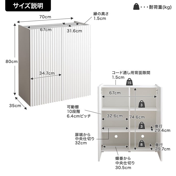■耐荷重:天板:15kg、可動棚(各):約3kg、底板:約8kg