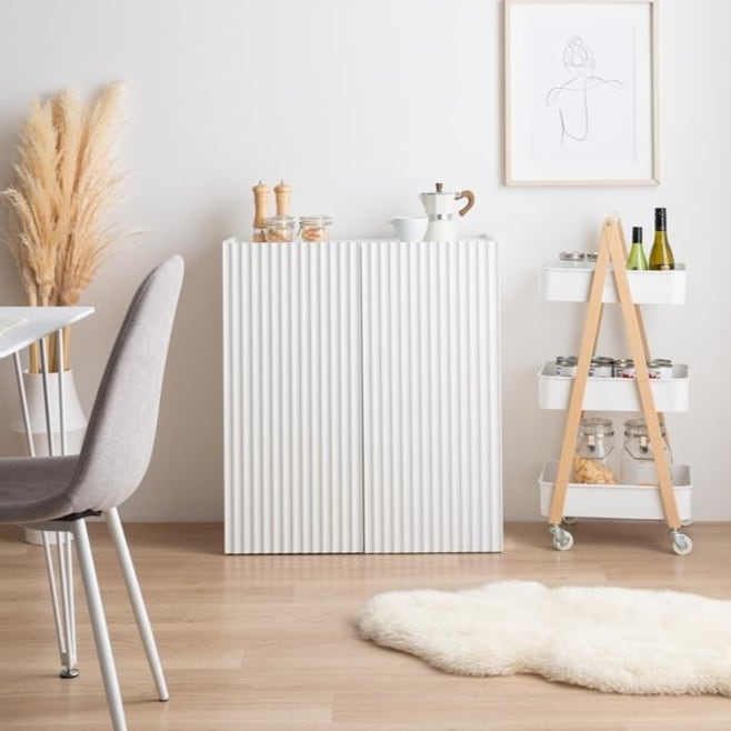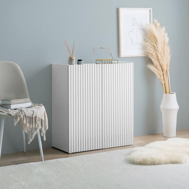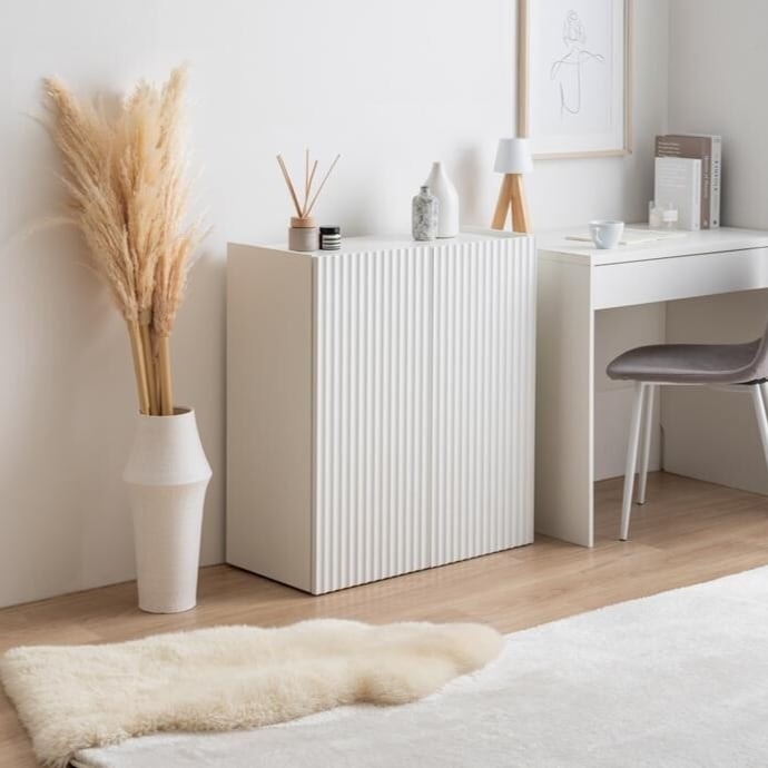 清潔感のあるホワイトと波型扉が魅せる『Sheep(シープ)』シリーズのコンパクトキャビネット。
