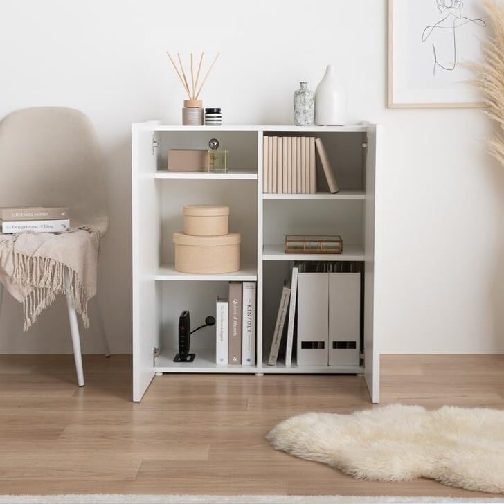 高さの異なるアイテムにも対応できる、可動棚4枚付きの扉収納。