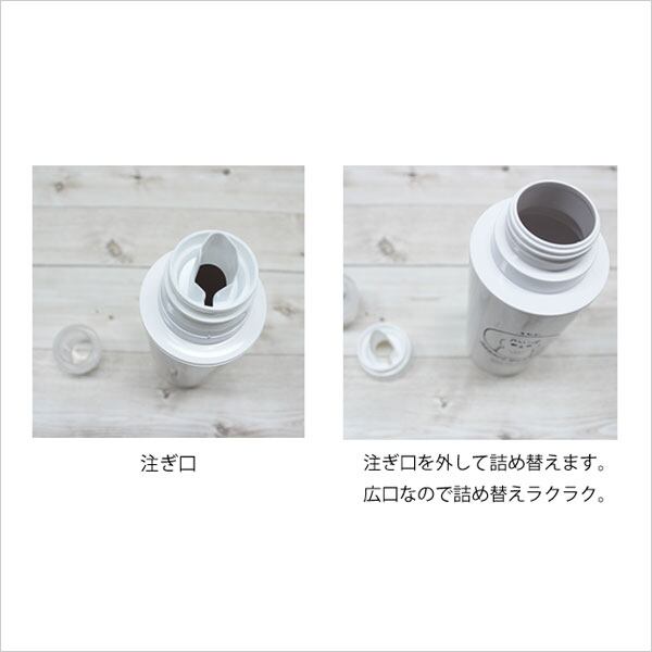 一番上のキャップを外すと注ぎ口、注ぎ口のキャップを回すと、広口の詰め替え口となっているので、詰め替えもラクラクです。