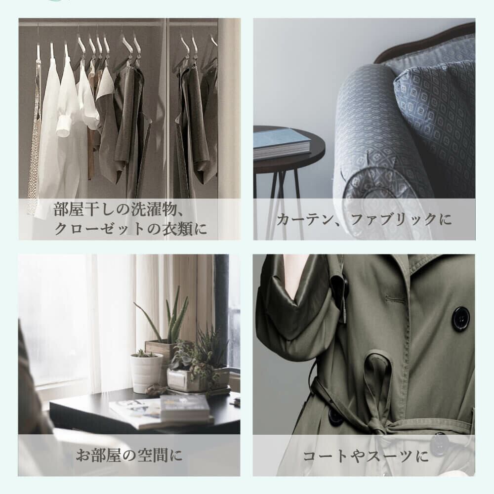 ■素材・成分:ユーカリ精油、緑茶エキス、柿渋エキス、銀イオン水溶液、カチオン系除菌成分、水、香料、エタノール
